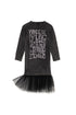 Rebel mid-length, soft T-shirt dress for retro street style. Main body in 100% natural cotton with tulle bottom. Features a round collar with raw edge, light gathering at the shoulder and text "we are the music makers and the dreamers of dreams". Sweater dress length is above the knee, tulle bottom falls longer.Print designed by Alex Trochut in collaboration with Little Creative Factory.