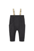 Black dungaree slacks with ivory and black striped suspenders. Feature adjustable straps, button front and side pockets. Made in a lightly padded fabric.