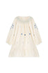 Chic cream colored dress with embroidered details in shades of blue with green accents. Features a rounded neck, button closures at back of neck, drop waist and long, loose fit sleeves.