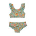 Feminine floral print bikini. Features ruffle trim scoop neckline and ruffle trim on bottom.
