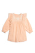 Gorgeous blush colored dress with delicate off-white embroidery. Features a loose fit, embroidered ruffle trim that goes over the shoulders and down half of the back, full lining elasticized wrists and button closures down the whole back. Made from 100% cotton.