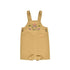 Cute honey colored short overall with beachy embroidery at chest. features button closures at sides and button snaps at bottom for easy dressing.