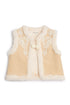 A statement accessory we absolutely love. Nude colored vest with soft cream fur trim and interior. Features short ties at front with poms on the ends and intricate embroidery on the front.
