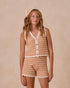 Gorgeous multicolor striped crochet set featuring a vest and shorts. There are coconut buttons down the front and beautiful crocheted scalloped trim.