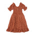 Floral midi length dress with a ruffle neckline, two pockets, three coconut button details on the front and full skirt.