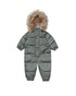 An adorable classic style snowsuit in a beautiful marine color. Features a detachable hood with fur trim, hidden zipper at the front, elasticized sleeve and leg openings, and waterproof fabric.