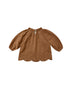Pretty bohemian style long sleeve blouse in a rust color. Features smocked neckline with one button loop closure at front, elasticized cuffs and beautiful embroidered eyelet detail finishes along scalloped hem and throughout.