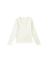 Sweet ribbed long sleeve top. Features rounded neck with picot edge trim, fixed ribbon bow detail and lettuce trim on wrists and hem.