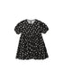 Adorable heart print dress. Features rounded neckline, slightly puffed sleeves with elasticized arm holes, keyhole back button closure and flared skirt perfect for twirling.