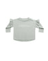 Long sleeve tee in beautiful "blue fog"color. Features ruffle trim detail on sleeves, crew neck, embroidered text "wildflower" on front and loose fit. Pair with either a mini skirt for girls or with the vines slouch pant or bloomers for baby.