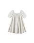 Pretty floral dress. Features smocked neckline with fixed bow detail, puffed short sleeves with elasticized arm openings and loose, flared bodice to skirt.
