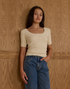 Wardrobe essential cropped-fit Scalloped Tee features a versatile fall staple, crafted from delicate pointelle knit fabric and detailed with scalloped sleeves and neckline.