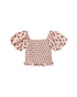 Our Trixie Top is a darling addition to any closet, featuring a cropped fit, bubbled sleeves, and a smocked bodice. Pair it with our Tiered Mini Skirt and bow for a perfectly coordinated look>