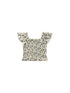 Feminine all over blue floral printed top. Features ruffled flutter sleeves and trim, smocked bodice and slightly cropped length.