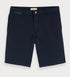 Mid length deep blue colored chino shorts. Features two side pockets, belt loops, two small back pockets, and hidden adjustable waistband inside.