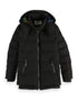 Warm black coat with a detachable hood, two zip pockets and brand logo down the zip center.