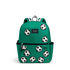 Sporty green backpack with soccer balls design. Features fuzzy soccer ball patches on the front, adjustable straps and zip closures. Front and side pockets provide compartments for school supplies, water bottle and more.