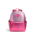 Metallic pink two tone backpack. Features pink and hot pink colorblocking, pink heart patch, adjustable straps, and zip closures with a tassel detail. Front and side pockets provide compartments for school supplies, water bottle and more.