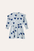 Adorable light blue dress with an all over true blue hearts print. Features a rounded neck, button openings on the top half of front, ruffle trimmed shoulders, cinched waist and wrists. Made in Portugal from 100% Lyocell.