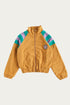 Soft, comfy jacket featuring polar lining for added warmth. Deep golden yellow with colorful striped shoulders and a cute patch on the front left side.