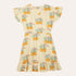Cute short sleeve dress with all over fruit print and text "a summer love story." Features ruffle trim sleeves, cross front, elasticized gathered waist and knee length skirt with bottom ruffle.