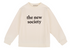 Solid off-white sweatshirt with black text "the new society" on chest. 100% organic cotton. Made in Portugal.