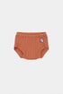 Muted burnt orange "autumn"colored wide ribbed bloomer. Features elasticized waist and B patch at left hip. Made from 100% organic cotton.