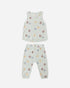 Ultra soft cotton jersey tank and pants set in seafoam green with an all over multi color floatie print. Features a sleeveless tank with a curved hem and coordinating slouch pants with button detail on the front.