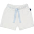 White shorts with light blue details spun from upcycled organic cotton and recycled polyester. Features a contrast drawstring waist, cuffed hems and cute pocket at back with navy waves embroidery.