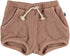 Soft waffle knit cotton shorts in a terra cotta color. Features drawstring waist with contrast string, two side pockets and slight bubble fit. Pair with the matching hoodie for an adorable set.