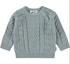 Dusty greenish blue cable knit sweater. Features ribbed cuffs and hemline, a rounded neck with two button button closure for easy dressing. Pair with the matching Sedge trousers for the perfect set. Made from 80% cotton and 20% wool.