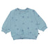 Blue sweatshirt for small children in the all over print of small, sweet smiley faces in dark blue. This sweatshirt is in 100% cotton, and it has a round neck with a rib edge and rib at the sleeves and bottom. It has an easy snap closure at the neck. Wear the sweatshirt with the Simeon joggers in the "Animal Living" print for the perfect look.