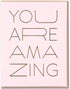 Gold foil "You Are Amazing" on pink paper card. Blank inside for your message.