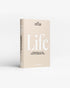 Discover this neutral & chic photo book :"Life", featuring a beautiful hardcover bookshelf design covered in beige cloth with large white text "life" and smaller black text "celebrating all the precious moments in life" at the bottom and " the coffee table album" at the top.
