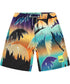 Knee-length swim shorts for active children in recycled polyester with UV protection 50+. The swim shorts have a loose fit, side pockets, elastic waist with drawstring and inner shorts in soft mesh. The swim shorts have a print of palm trees in blue, black, purple, and orange shades.
