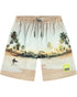 Knee-length swim shorts for active children in recycled polyester with UV protection 50+. The swim shorts have a loose fit, side pockets, elastic waist with drawstring and inner shorts in soft mesh. The swim shorts are light-coloured with a print of a beach, palm trees, and surfers.