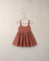 Fun and flowy in a beautiful heart eyelet fabric. Features fixed front bows, adjustable length spaghetti straps, smocking at the back, and a front V waistline.