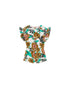 Cute terry romper with colorful flower print. Features ruffle trim sleeves, inner elastic at the waist and teardrop closure at back.