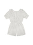 Chic striped romper in a linen cotton fabric. Features a rounded neckline, v neck ruffle along front that continue down the open back, elasticized waist and slightly flared bottom.