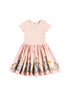 Sweet short-sleeved dress in organic cotton. The top is snug-fitting in a ribbed jersey, while the skirt is made of smooth jersey. The print on the skirt of the dress features a playful print of cats, bunnies, frogs and ducks with colorful flowers over their heads.