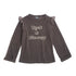 Long sleeved t shirt with "Rock & Flowers" text on the front and ruffle trimmed shoulders. Pair with this skirt for a cool feminine yet edgy look.