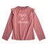 Long sleeved t shirt with "Rock & Flowers" text on the front and ruffle trimmed shoulders.