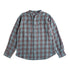 Deep teal and charcoal colored checked shirt. Features mock neck, two front pockets and a button front.