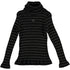 Black ribbed turtle neck with thin gold lurex stripe and small signature star applique at center chest.