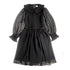 Beautiful plumeti textured dress in black. Features rounded collar with ruffle trim, gathered waist, sheer sleeves with elasticized cuffs, zipper at the back and full lining on the skirt and bodice.