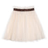 Adorable above the knee tulle skirt in a sheer off white tulle top layer with matching woven cotton underneath and a chic animal print waistband. Features elasticized waist with frill detail at top and 100% cotton lining. Made in Spain.