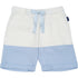 White shorts and light blue color blocked short spun from upcycled organic cotton and recycled polyester. Features a contrast drawstring waist and cute pocket at back in blue with navy waves embroidery.