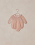 A sophisticated romper with a vintage-inspired silhouette. Features a bubbled shape, elasticized legs and wrists, a ruffled lace trim collar, 3 button closure at back of neck and button snaps between the legs for easy changing. Made in a soft velvet fabric.