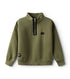 Cool half zip sweatshirt in a not so basic neutral shade of olive green. Features deconstructed custom torn edges, half zip front with black trim, large white serious face on back and small black embroidered "NU" on left chest.