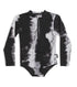 Black and white long sleeved one piece swimsuit with a cool tie dye print. Features zip front for easy dressing.